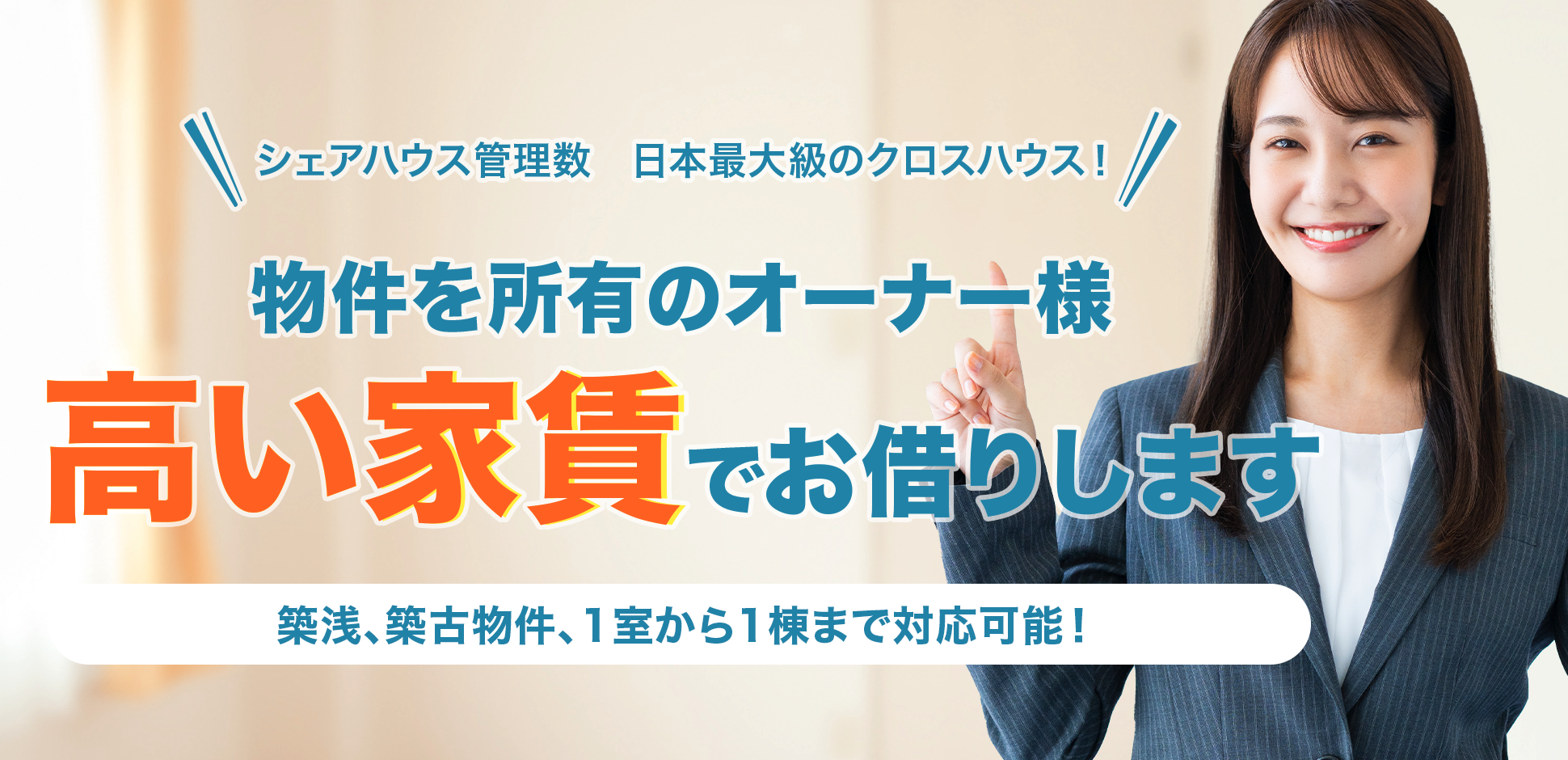無料相談や無料査定、収益シミュレーションを通じて、所有物件をどのように活用できるかを確認できます。空室対策、安定収入、相続物件の活用、売却前の一時運用などを検討している方は、クロスハウスを選択肢のひとつとしてチェックしてみるとよいでしょう。