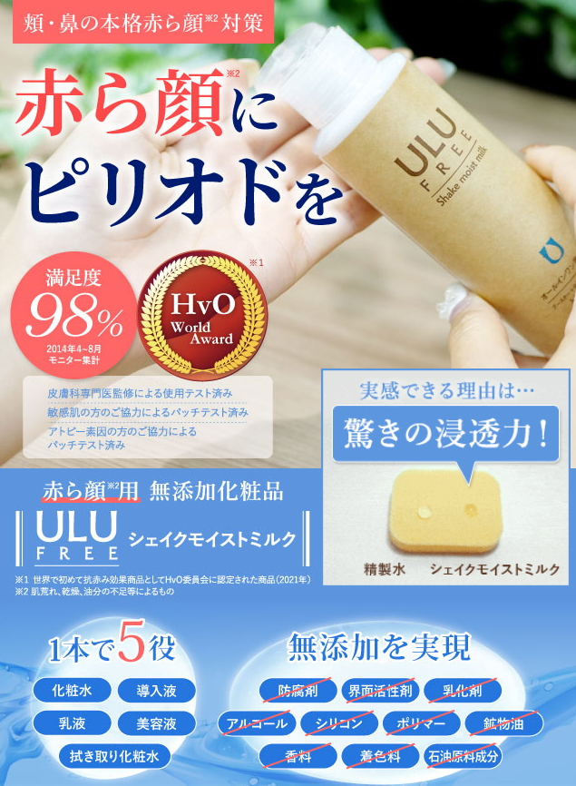 ULUシェイクモイストミルクは、株式会社日本ドライスキン研究所が開発した、導入液・化粧水・乳液・美容液・拭き取り洗顔の5役をこなすオールインワン化粧品です。